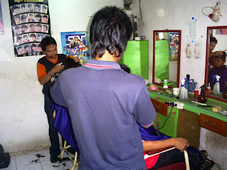 -K = (benerin rambut sambil ngeliat kaca) cukur sekian dan terima kasih bang . (nyelonong keluar)